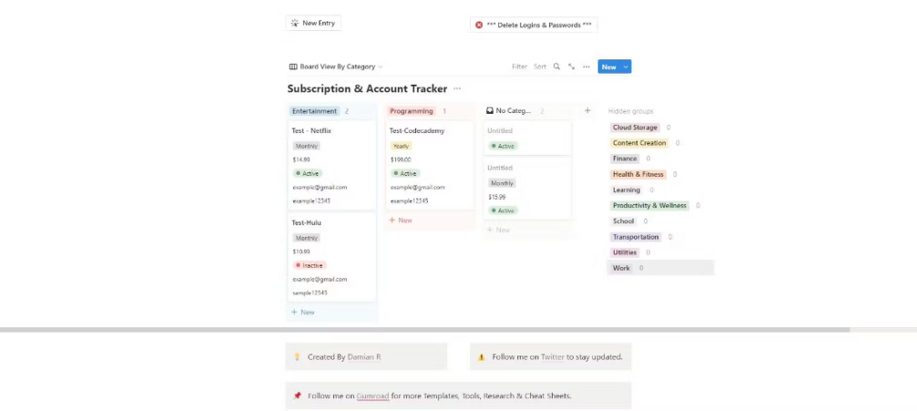 But we didn't stop there. We also included additional buttons in our Notion template to make it even more convenient to use. From easily marking a subscription as active or inactive to filtering by category, our Subscription Tracker and Login Tracker has everything you need to stay organized and on top of your subscriptions.